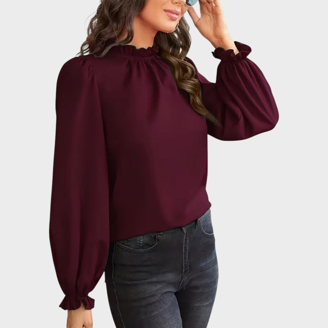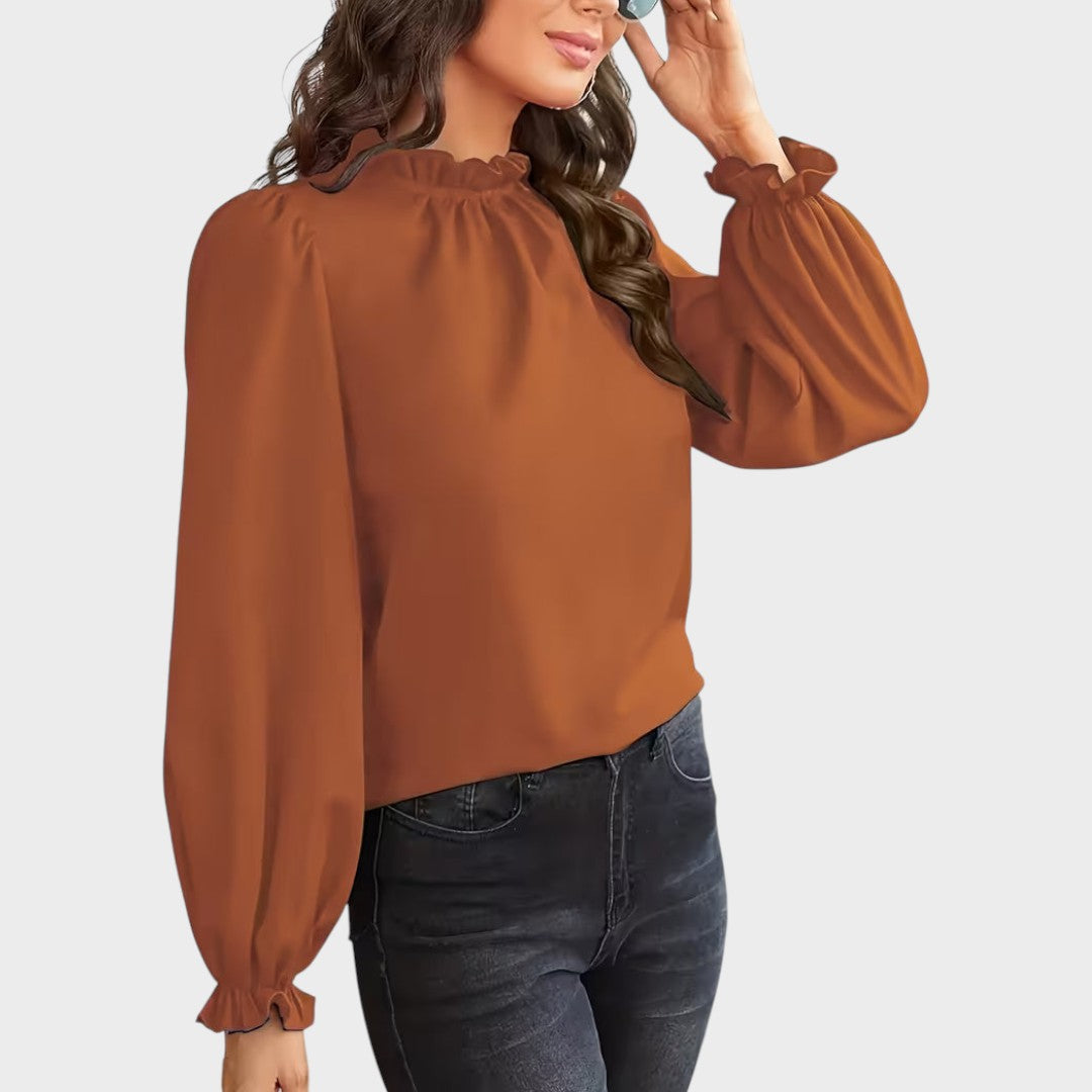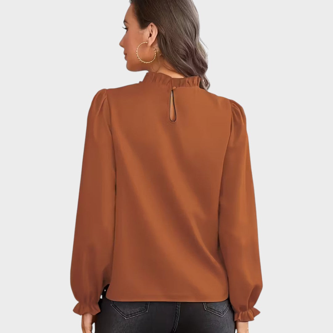 Esta blusa foi criada para quem aprecia elegância subtil e conforto em perfeita harmonia. A gola com acabamento delicado acrescenta um toque feminino e sofisticado, enquanto as mangas compridas com punhos franzidos criam uma silhueta leve e fluida.