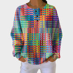 Esta blusa combina conforto e originalidade num design moderno e marcante. Com um padrão geométrico cheio de personalidade e um toque suave, é perfeita para quem gosta de se destacar com elegância e descontração. O corte solto proporciona liberdade de movimento e um visual versátil que se adapta tanto a momentos casuais como a ocasiões mais especiais.
