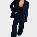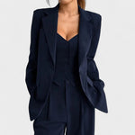 Este conjunto foi criado para mulheres que gostam de expressar confiança e elegância em cada detalhe. Composto por blazer, colete e calças de corte fluido, combina o charme clássico do fato feminino com um toque moderno e ousado.