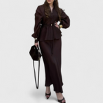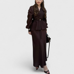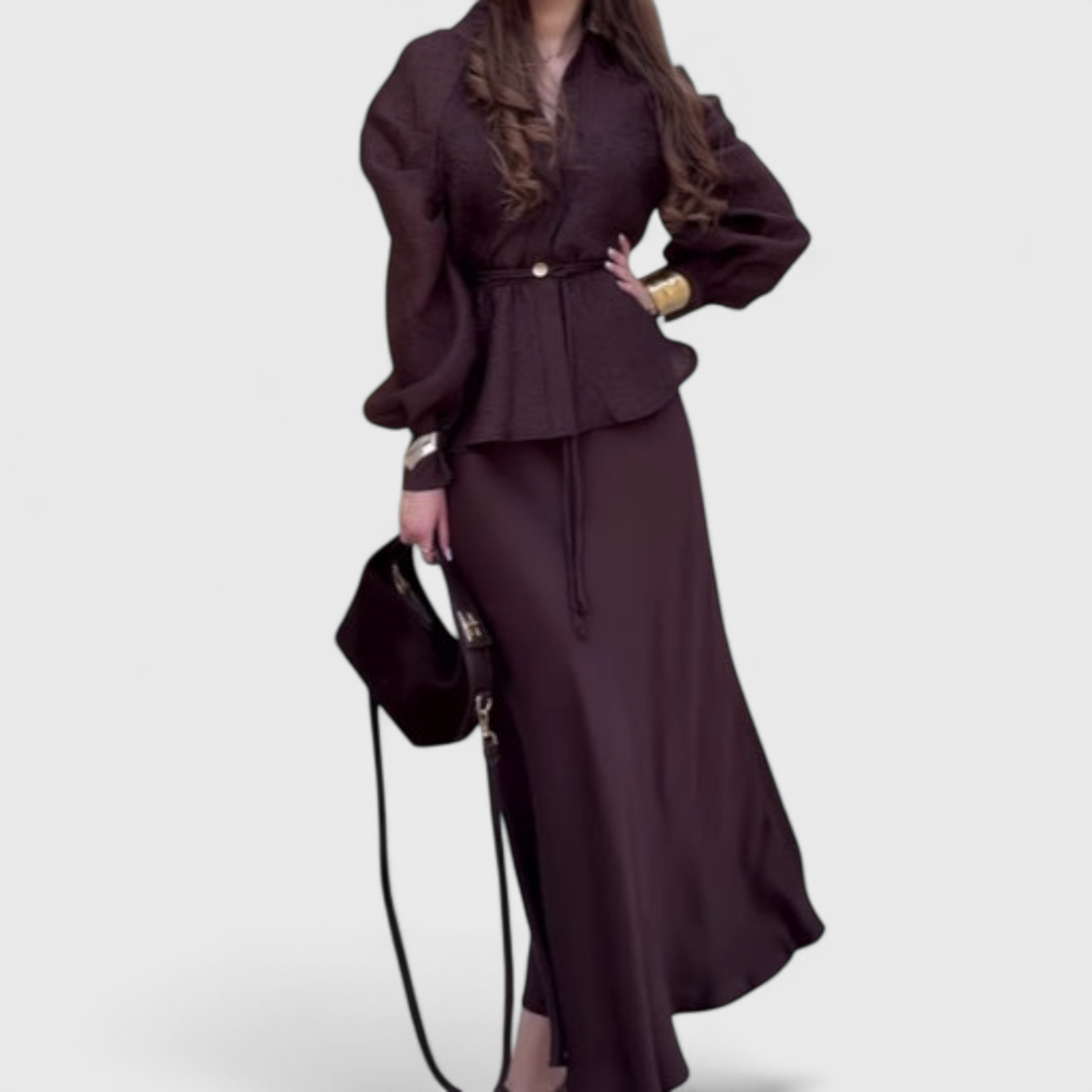 Este conjunto de duas peças combina sofisticação e conforto em cada detalhe. A blusa estruturada com cinto ajustável valoriza a silhueta, enquanto a saia longa fluida garante um movimento gracioso e refinado.