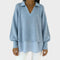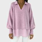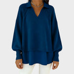 Esta camisola combina o conforto de um corte amplo com a elegância de detalhes pensados ao pormenor. O decote em V com gola estruturada cria um visual moderno e feminino, enquanto a dupla camada acrescenta fluidez e movimento à peça.