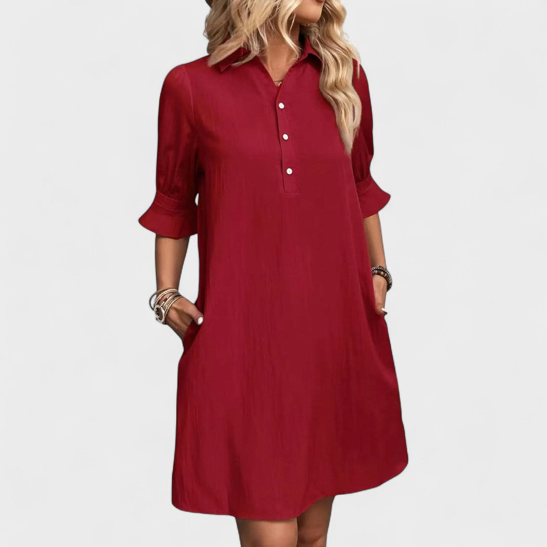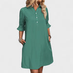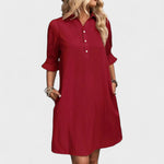 Este vestido foi criado para realçar a beleza natural com um toque leve e elegante. O corte solto garante conforto absoluto, enquanto os detalhes delicados, como os botões frontais e as mangas ajustadas, trazem sofisticação na medida certa.