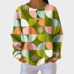 Esta blusa combina conforto e originalidade num design moderno e marcante. Com um padrão geométrico cheio de personalidade e um toque suave, é perfeita para quem gosta de se destacar com elegância e descontração. O corte solto proporciona liberdade de movimento e um visual versátil que se adapta tanto a momentos casuais como a ocasiões mais especiais.