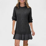 Este vestido em malha é a fusão perfeita entre aconchego e estilo. O tricot com padrão trabalhado dá-lhe um toque sofisticado, enquanto a saia plissada acrescenta leveza e movimento.