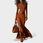 Este vestido é a definição de sofisticação moderna. O seu corte justo e fluido realça a silhueta, enquanto o fecho frontal e o cinto ajustável acrescentam um toque contemporâneo e versátil.