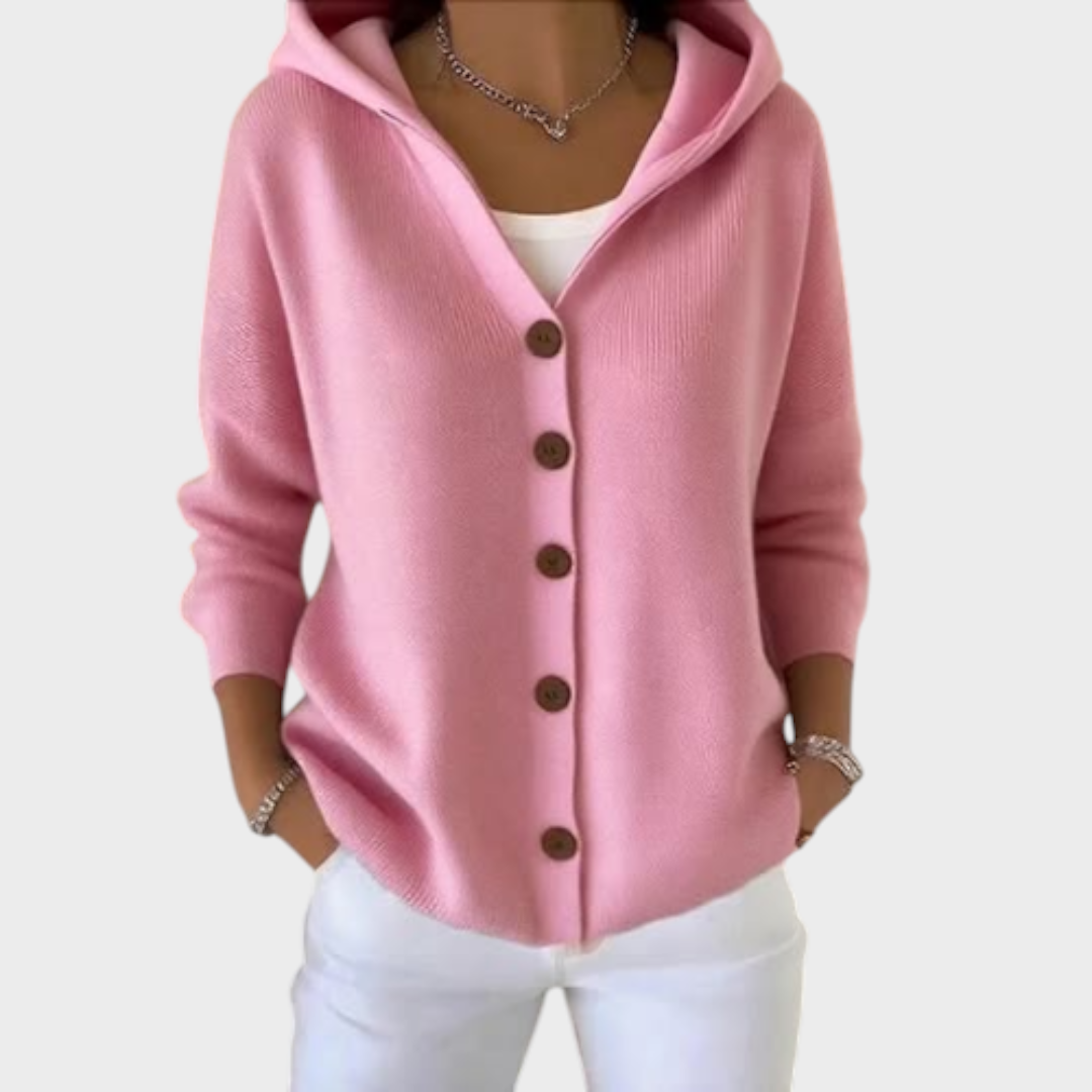 Este casaco de malha com capuz foi desenhado para unir praticidade e charme em cada detalhe. Os botões frontais dão-lhe um toque clássico, enquanto o corte moderno e versátil permite criar looks casuais e confortáveis para o dia a dia.