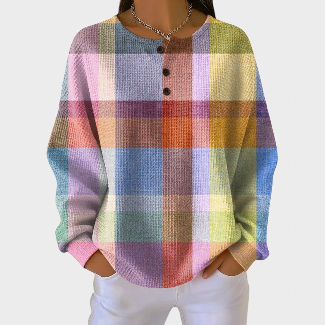 Esta blusa combina conforto e originalidade num design moderno e marcante. Com um padrão geométrico cheio de personalidade e um toque suave, é perfeita para quem gosta de se destacar com elegância e descontração. O corte solto proporciona liberdade de movimento e um visual versátil que se adapta tanto a momentos casuais como a ocasiões mais especiais.