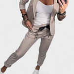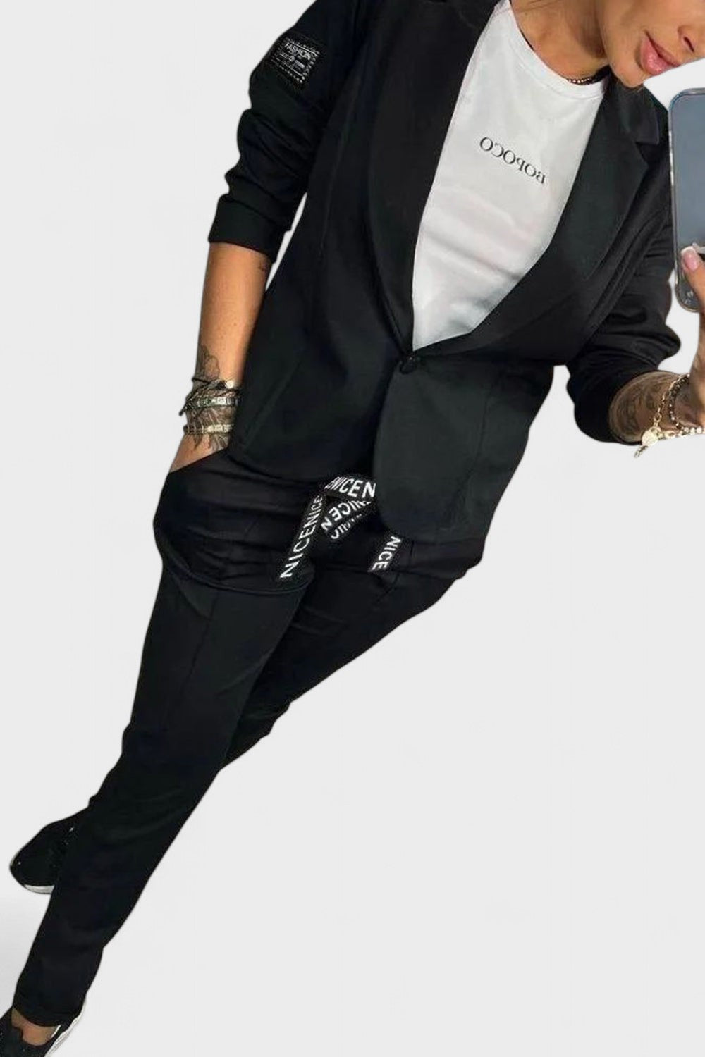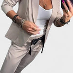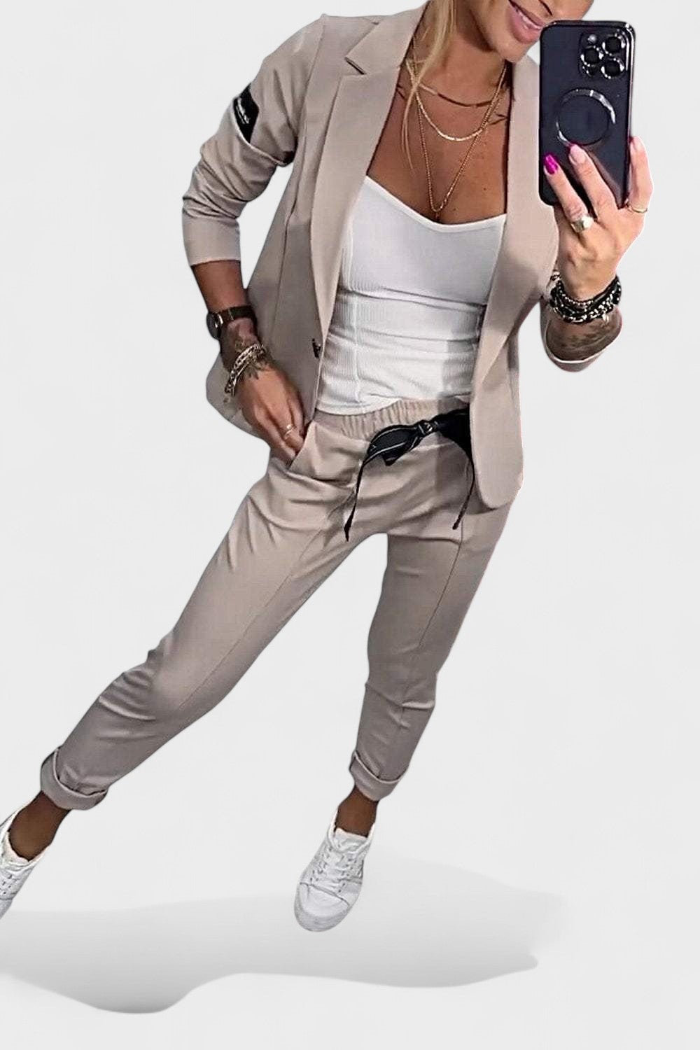 Este conjunto foi criado para mulheres que valorizam o equilíbrio entre estilo e praticidade. Composto por blazer estruturado e calças de corte descontraído, oferece um visual moderno e confortável, ideal tanto para o trabalho como para momentos casuais.