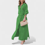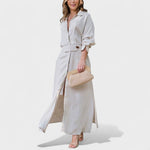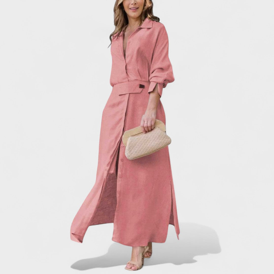 Este vestido comprido combina sofisticação e conforto em cada detalhe. O corte fluído garante movimento natural, enquanto o cinto ajustável valoriza a silhueta de forma subtil.