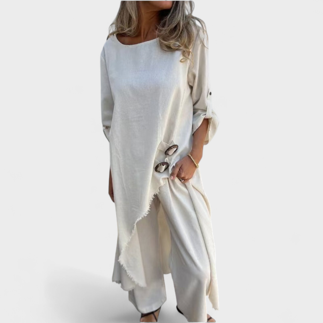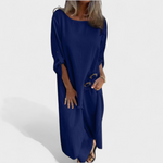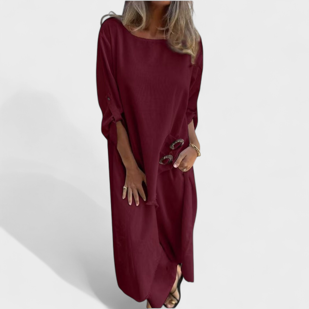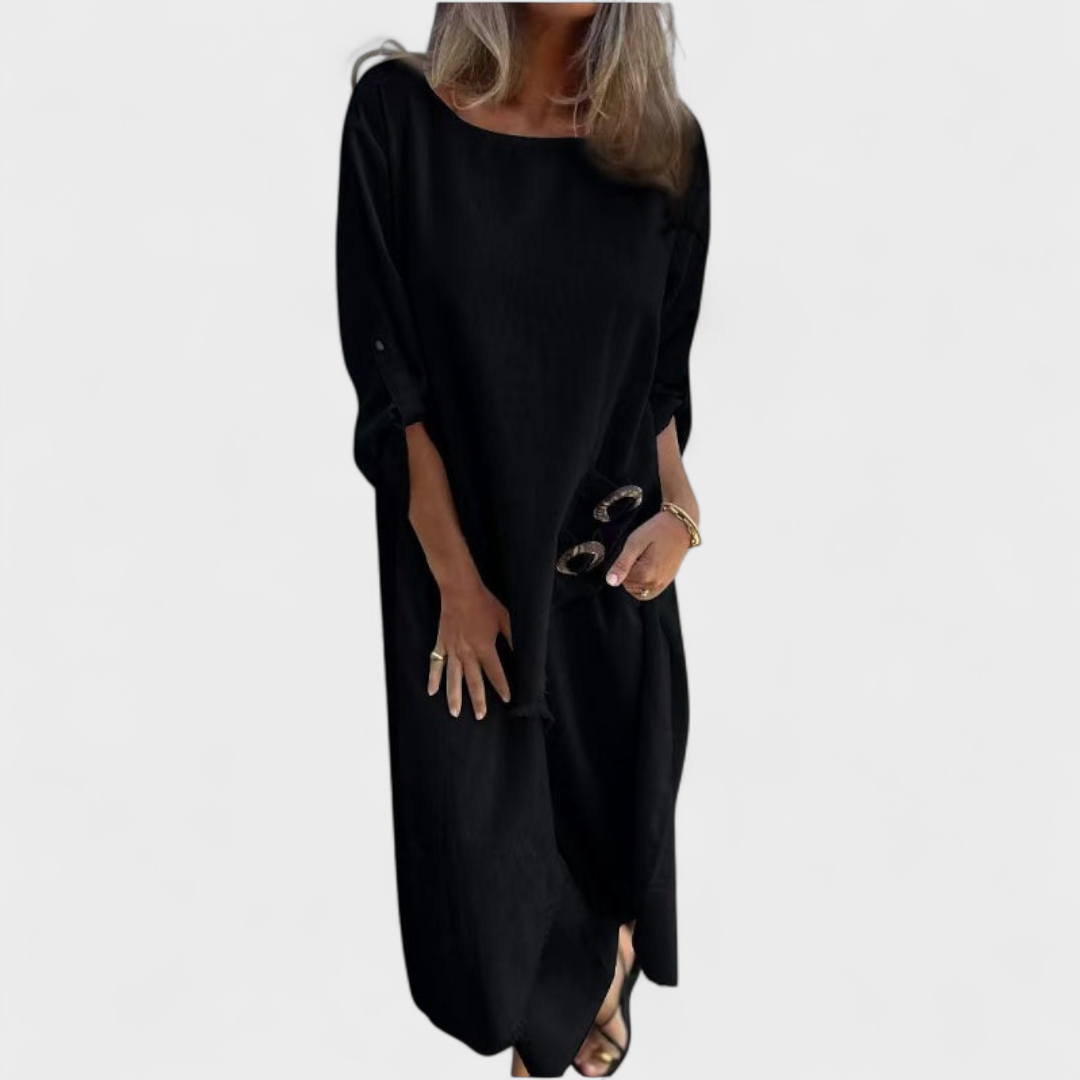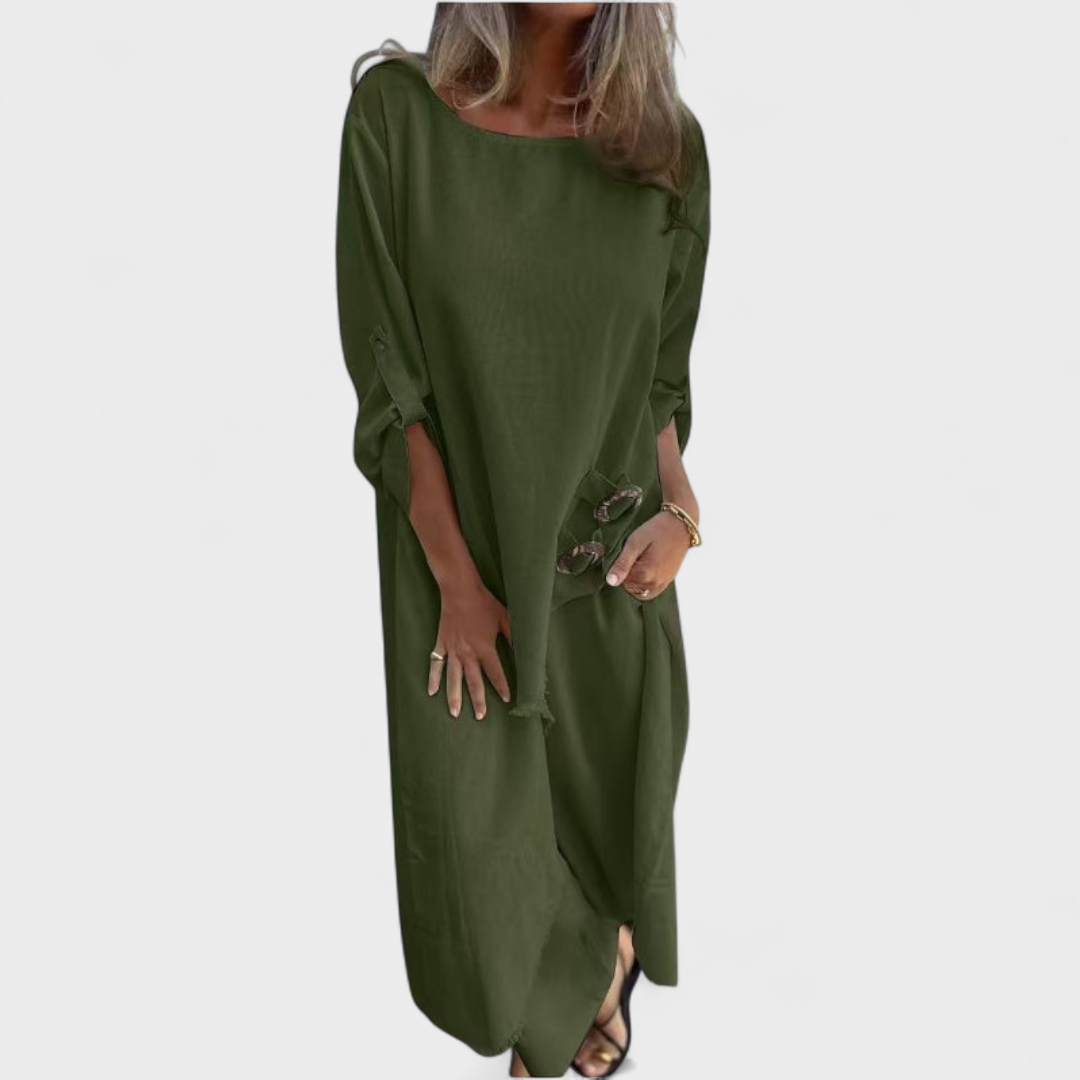 Um vestido amplo e fluído que une conforto e elegância num só modelo. Com um design descontraído, mas cheio de charme, adapta-se facilmente a diferentes ocasiões — desde um passeio descontraído até a um jantar sofisticado.