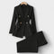Este conjunto foi desenhado para mulheres que apreciam a harmonia entre classe e confiança. Com blazer estruturado e calças de corte impecável, oferece um visual refinado e atemporal, perfeito para ocasiões profissionais ou eventos especiais.