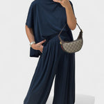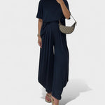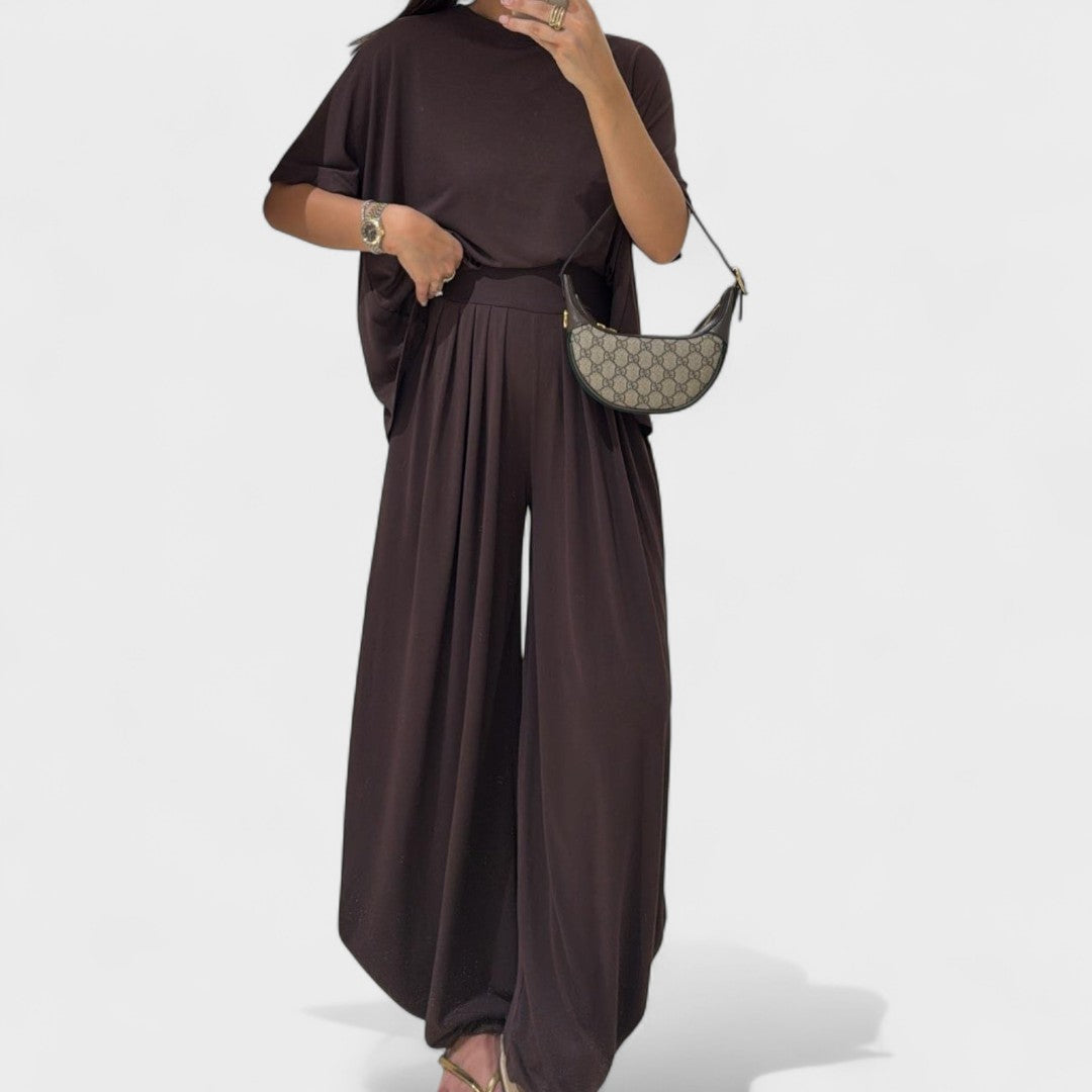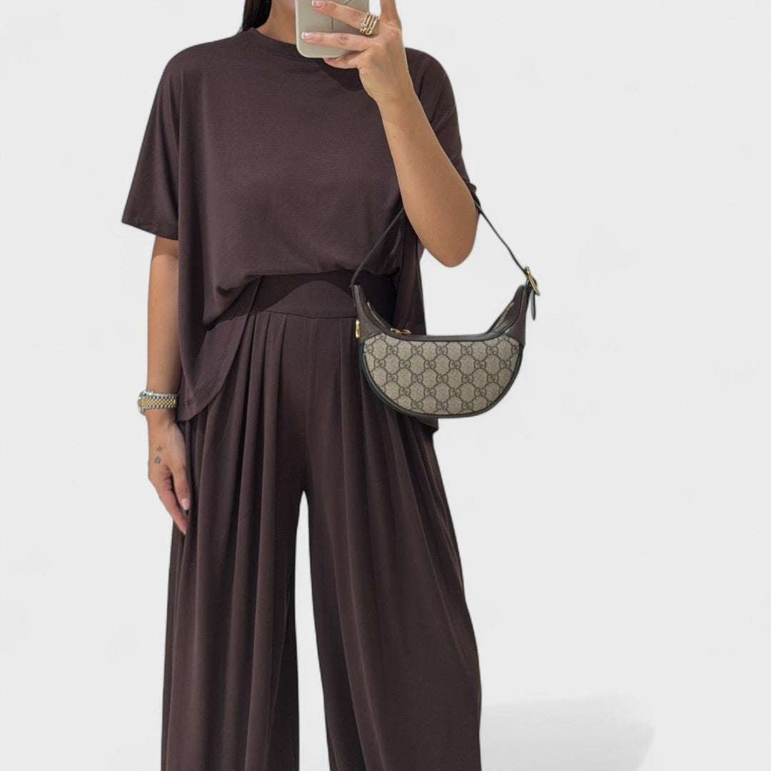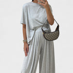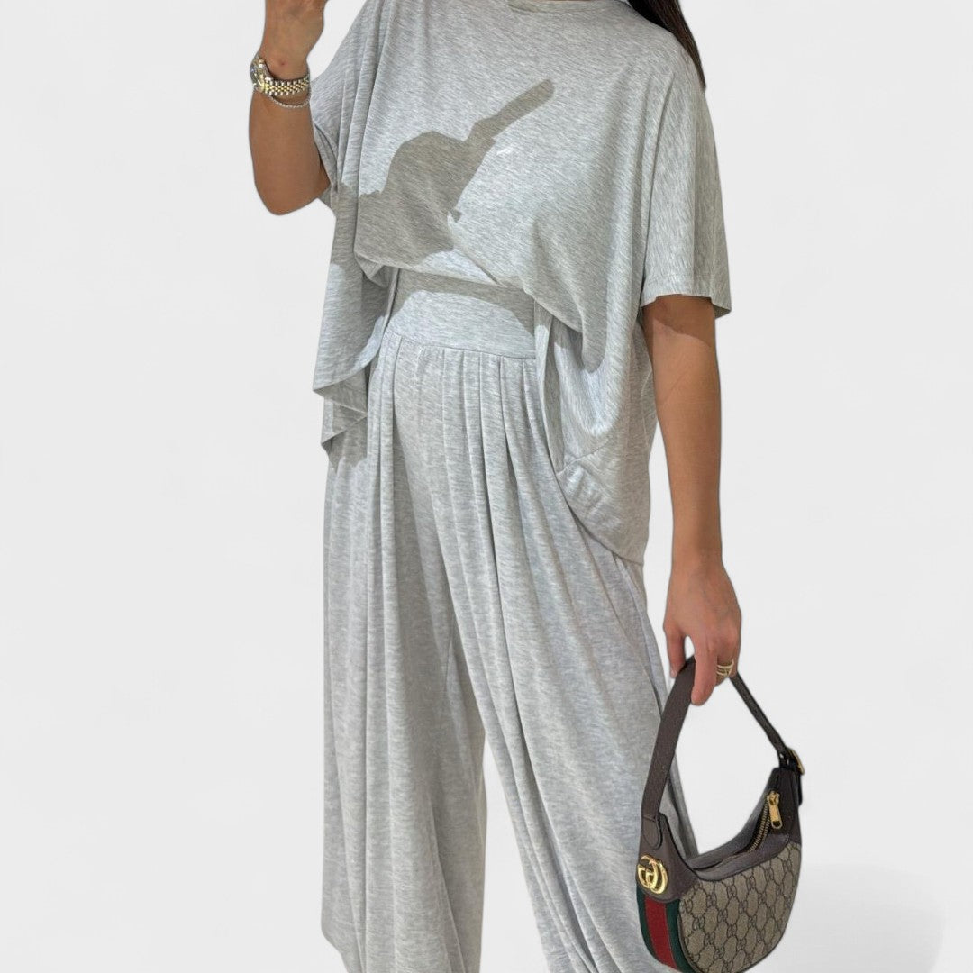 Este conjunto é a fusão perfeita entre conforto e sofisticação. A t-shirt fluída combina-se harmoniosamente com as calças largas de corte solto, criando um visual moderno e leve.