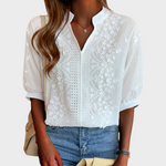 Esta blusa combina sofisticação e frescura, com detalhes bordados delicados que elevam instantaneamente qualquer look. O design versátil adapta-se tanto a um dia de trabalho como a um passeio descontraído, proporcionando sempre um toque de charme subtil e intemporal.