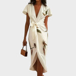 Um vestido que une delicadeza e sofisticação numa só peça. O corte envolvente realça a silhueta de forma subtil, enquanto o laço ajustável na cintura acrescenta charme e feminilidade.