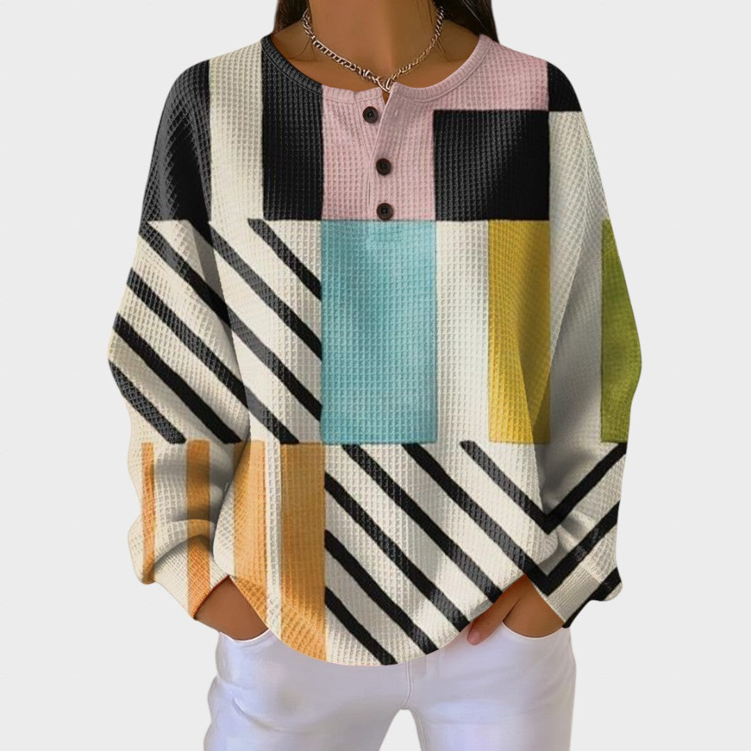 Esta blusa combina conforto e originalidade num design moderno e marcante. Com um padrão geométrico cheio de personalidade e um toque suave, é perfeita para quem gosta de se destacar com elegância e descontração. O corte solto proporciona liberdade de movimento e um visual versátil que se adapta tanto a momentos casuais como a ocasiões mais especiais.