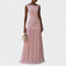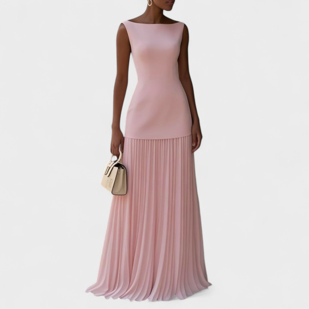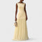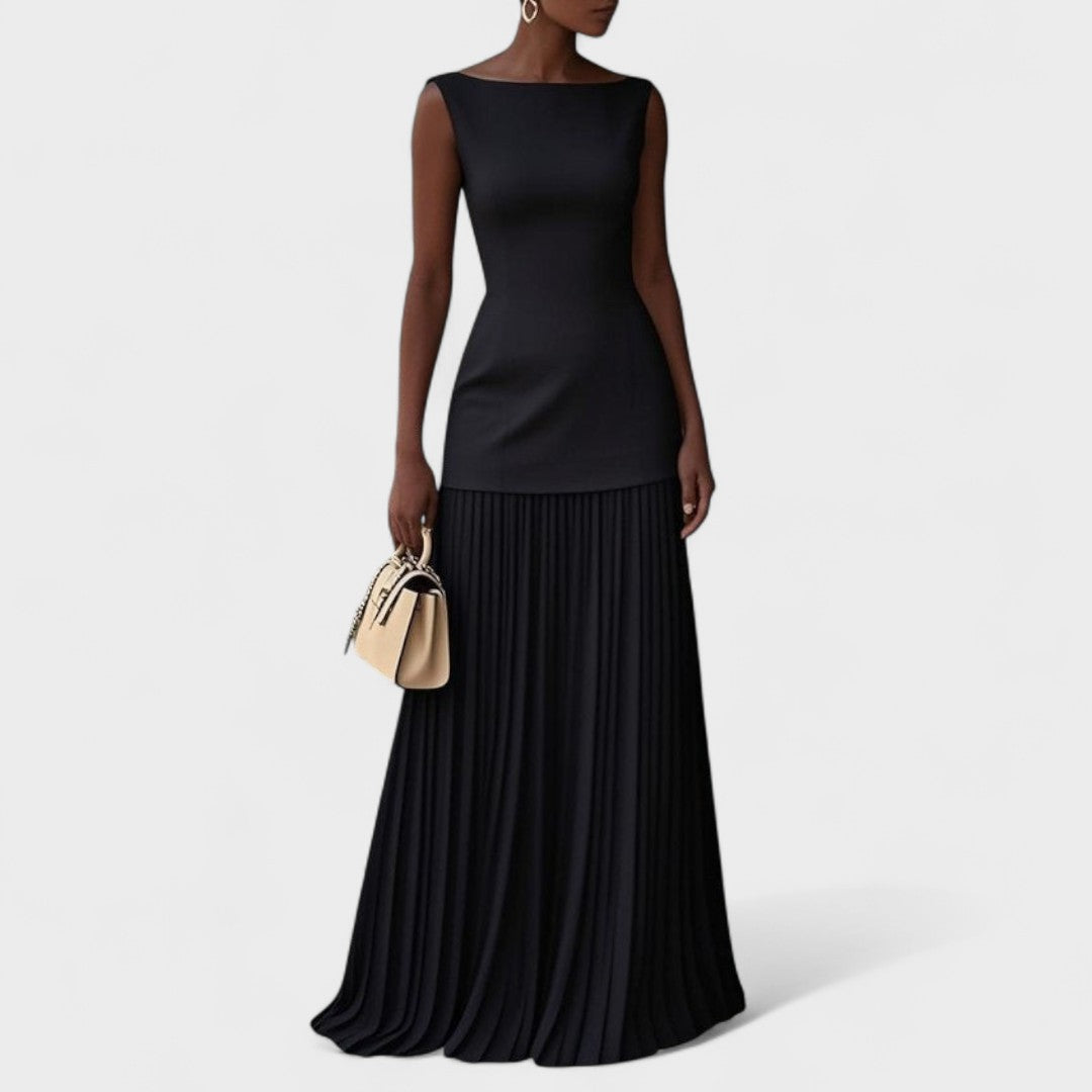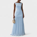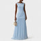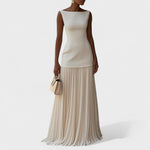 Este vestido longo foi desenhado para quem procura sofisticação com um toque de leveza. O corte justo na parte superior realça a silhueta de forma subtil, enquanto a saia plissada adiciona movimento e graça a cada passo.
