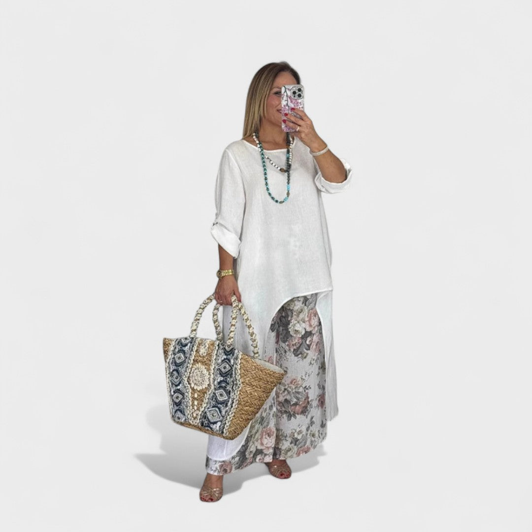 Este conjunto transmite frescura e sofisticação de forma natural. Com um corte fluido e detalhes que valorizam a silhueta, é a escolha ideal para quem deseja sentir-se confortável sem abdicar de estilo.
