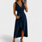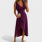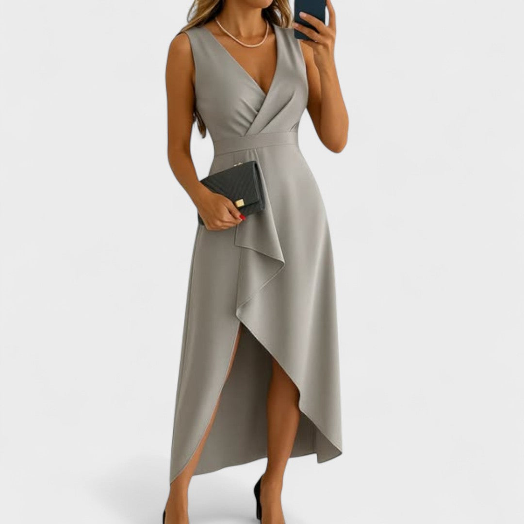 Um vestido que alia elegância intemporal a um corte moderno e feminino. O decote cruzado valoriza a silhueta, enquanto a saia assimétrica confere fluidez e um toque distinto ao visual.