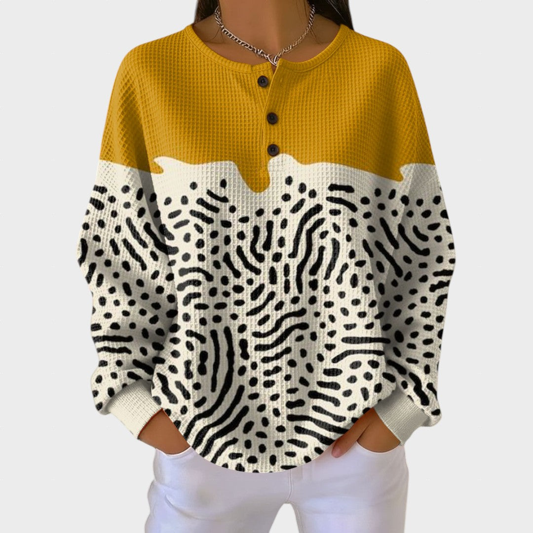 Esta blusa combina conforto e originalidade num design moderno e marcante. Com um padrão geométrico cheio de personalidade e um toque suave, é perfeita para quem gosta de se destacar com elegância e descontração. O corte solto proporciona liberdade de movimento e um visual versátil que se adapta tanto a momentos casuais como a ocasiões mais especiais.