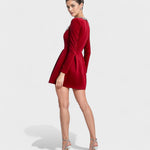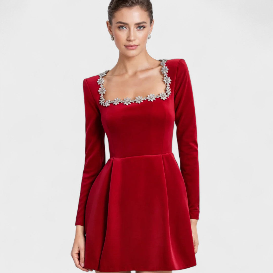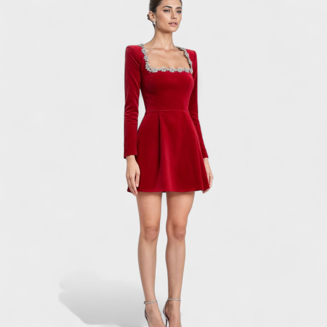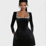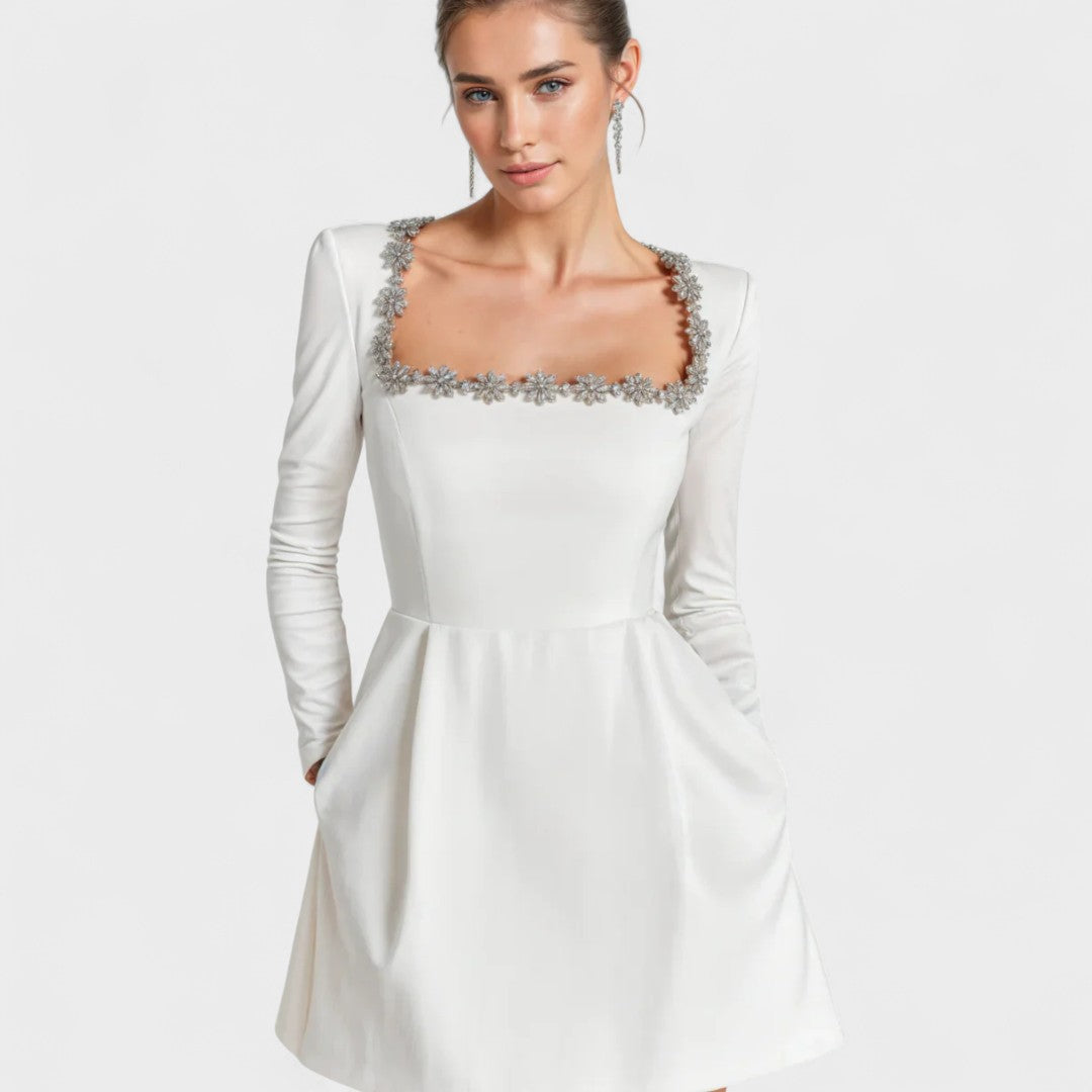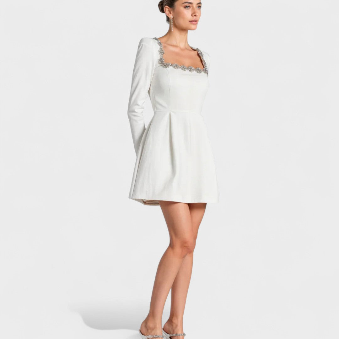 Este vestido foi criado para realçar a tua feminilidade com um toque de sofisticação irresistível. O corte justo e o tecido de alta qualidade valorizam as curvas, enquanto o decote quadrado adornado com detalhes delicados adiciona um toque de glamour.